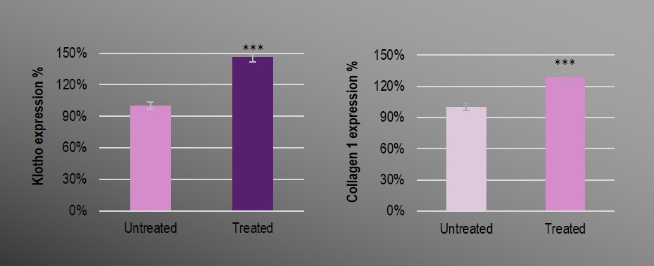 In this example, the Arrayscan™ technology allows us to observe the effect of the tested compounds on the expression of Klotho and Collagen I proteins, which are both interesting targets in cosmetic ingredient research. This image has a double role : first, it clearly shows the effect of a cosmetic ingredient on protein expression. Second, these are beautiful images, perfectly usable in marketing documents to illustrate accurately and aesthetically the action of a product on skin cells. To support and make your documentation even more convincing, we can produce graphs using the Arrayscan™ numerous data to confirm your results with statistically verified numbers.
