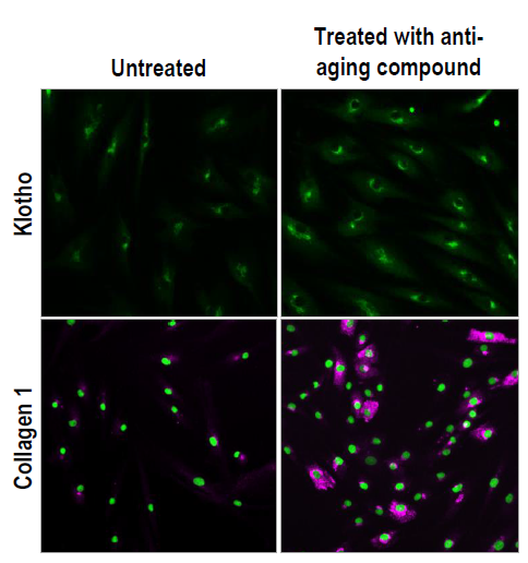 Quantification of 2 anti-aging proteins by automated microscope after treatment with an active molecule: Klotho in the endoplasmic reticulum (green) and Collagen I in the cytoplasm (pink).